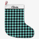 This Christmas stocking is shown in a black and aqua color buffalo plaid print.