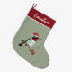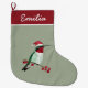 Bas de Noël personnalisé avec un colibri à gorge rubis portant un chapeau de Père Noël sur un arrière - plan vert.
