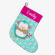 This happy little penguin is the featured star, is this design. He's ready for the winter season with his striped scarf, pink earmuffs. The blue-green background has an overlay of white snowflakes.