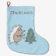 L'illustration de dessins animés à la mode montre de mignons hérisses accrochés à des ornements sur son sapin de Noël sur fond de neige bleue. Personnalisez avec du texte personnalisable en police marron moderne