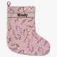 Motif de sucre de canne rayé mignon dans des couleurs pastel doux de vert et rouge sur un arrière - plan de parties scintillant rose faux. Grand accent de vacances à accrocher sur le manteau. Chaque ami et membre de la famille pourrait avoir leur propre stock de Noël personnalisé avec leur nom en lettres noires en gras.