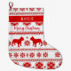 Silhouette images of French Bulldogs are the feature in the pattern on this fun personalized Christmas stocking. Along with the dog images are snowflakes and geometric designs. The script text "Merry Christmas" is below a red border with your custom name in white. Everything is bright Holiday red on a white background.