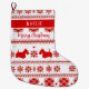 Silhouette images of Scottish Terrier dogs are the feature in the pattern on this fun personalized Christmas stocking. Along with the dog images are snowflakes and geometric designs. The script text "Merry Christmas" is below a red border with your custom name in white. Everything is bright Holiday red on a white background.
