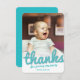 Carte plate de remerciement avec grande esquisse 'Merci' en bleu gras et écriture enfantine pour l'anniversaire d'un garçon.