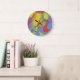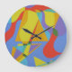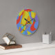 This abstract clock features a central triangle surrounded by vivid bursts of color reminiscent of Mardi Gras festivities. The strong geometric center contrasts with lively, playful background shapes, creating a dynamic and contemporary design that instantly brings joy to any room.