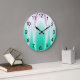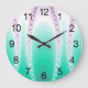 Grande horloge murale ronde présente l'art fractal abstrait en dégradé violet et vert avec des chiffres noirs.