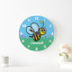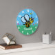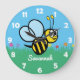 Kid Personalized Cute Little Bee dans le Wall Clock de Garden. Girls black and yellow bumblebee flying in a blue sky with green grass with flowers. Personnalize with name in white pretty script. Great personalized toxits for girls who love bumblebees and garden themes.