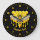 Honey bee with open wings icon over bee hive and honey drops. Custom background color. Custom.