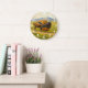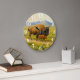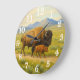 Wilderness wall clock captures a protective adult bison guiding its calf along a prairie trail, surrounded by golden grasses and distant mountains. White numerals on nature-toned backdrop create heartwarming wildlife charm—ideal for cabin decor or nature lover gifts.