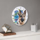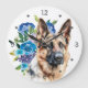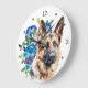 Coincé dans cette aquarelle de fleurs bleues et violettes et de feuilles verts est une belle image d'un Chien berger allemand. Les chiffres et les marqueurs gris foncé autour du périmètre rendent cette horloge facile à lire. Tout est posé sur un arrière - plan blanc.