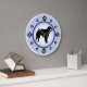 Les propriétaires et les amoureux de les chiens de Borzoi apprécieront ce design moderne amusant avec une silhouette de Borzoi et des empreintes de pattes représentant les chiffres sur le visage de l'horloge, avec un arrière - plan de bleu et un anneau bleu foncé.