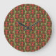 Une horloge murale acrylique ronde chic, avec un motif traditionnel du Bouclier tribal égyptien en rouge rouillé, surligné en noir sur un arrière - plan vert. Faisant partie de la collection Posh and Painterly "Egyptian", ce motif peut être facilement ajusté pour s'adapter à n'importe quelle horloge murale.