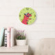 Horloge murale mûre dinosaure pour enfants avec une illustration colorée d'un dinosaure de dessin animé rouge avec une haleine ardente sur arrière - plan vert. Cette mignonne horloge en dinosaure aux couleurs vives s'ajoute à la décoration de la chambre pour enfants. Vous pouvez supprimer les chiffres de cette horloge dinosaure en cliquant sur le lien "Effacer" à droite de la page. Plus avec ce mignon dinosaure : com