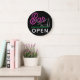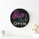Belle horloge contemporaine rétro art mural avec néon rose vif, vert citron et blanc de couleur Bar Ouvert typographie et calligraphie script lettering design. Excellent porte-monnaie pour ceux qui aiment divertir les amis et la famille.