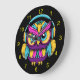 hibou rétro super multicolore portant un casque. Cette chouette de bande dessinée a des plumes vives et colorées en rose, bleu, jaune, turquoise et violet. Il porte un ensemble de casques funky modernes en jaune et bleu.