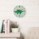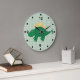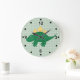 Fun wall clock done dans une checked pattern, with black numbers and dots. Cute cartoon graphics of a green stegosauus dinosaur decorates the middle of the clock. Great wall decor for any little boy's room, et makes a great idea.