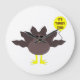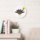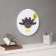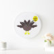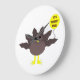This awesome clock fea funny cartoon of a turkey with big black eyes, a small yellow beak and tail feathers broing up The feet are facing in opposite directions making the turkey look clouy. The turkey is holding a yellow balloon with a message inside that says "it's turkey time". This is a fun thanksgiving party design.