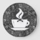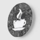 Coffee theme kitchen wall decor clocks with image of a coffee cup and saucer on pretty grey damask pattern on the clock face in this java themed design for a kitchen, family room or living room. Great vend pour coffee or tea drinkers.