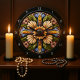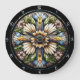 Cette très belle horloge murale présente un superbe design en vitrail avec une croix proéminente formée d'un tournesol rayonnant et de motifs floraux environnants. Les détails complexes et les couleurs douces et pastel, dont les jaunes, les bleus et les verts, créent une pièce sereine et édifiante, parfaite pour toute maison. Modifiez la couleur des numéros d'horloges dans l'outil Design en fonction de vos couleurs préférées.