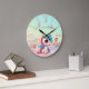Cette horloge murale personnalisée magique et enchanteresse dispose d'une mignonne licorne de bébé avec des cheveux arc-en-ciel et de grands yeux. La douce petite licorne est assise sur un nuage de parties scintillant bleu et rose, et plusieurs coeurs de feuille rose flottent à côté d'elle. L'arrière - plan est un motif à gradient arc-en-ciel. Un exemple de nom est imprimé en haut, que vous pouvez personnaliser pour inclure votre propre nom ou texte personnalisé.