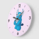 Déplaisant mignon horloge enfant avec un démon de dessin animé bleu avec crâne kawaii et regard fou en rose pastel et bleu.