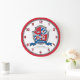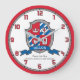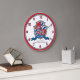 Les Knights Style shield monogram letter E art name simple wall clock in shades of red, blue white and grey. Personalize with your own name and name meaning for a personalized touch to your child's menacom or nursery, this example is for names starting with the letter E. currently reads Edward Guardian of wealth diged and prosperous. Idéal for a venin to a new baby boy, for a christening, baby naming ou baby shower. Unique shield drawing, graphic art, name research, wording and design by Sarah Trett. www.sarahtrett.com for www.mylittleeden.com