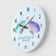 Une horloge au design romantique délicat. 2 élégants papillons aquarelles, peints, violets et verts. Un coeur de pois rose les surplombe. Un arrière - plan d'aquarelle bleu clair.