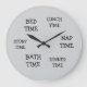 Horaire amusant pour les enfants avec horaire quotidien. Cette horloge de nouveauté peut être utilisée dans les chambres ou les nurseries. La conception de l'horloge est de couleur grise avec du texte noir. Le texte écrit comprend : HEURE DU DÎNER, HEURE DU PAN, HEURE DE L'HISTOIRE, HEURE DU BAIN, HEURE DU LIT ET HEURE DU DÉJEUNER. Vous avez la possibilité de changer la couleur de l'horloge en fonction de votre décor.