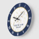 Hair stylist wall clock with a navy blue trim, white roman numbers, a pattern of scissors in faux gold and your name or the name of your hair salon in blue.