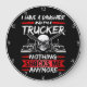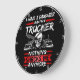 Cette horloge murale audacieuse témoigne de la résilience d'un conducteur de camion qui est aussi un parent. Contre un arrière - plan noir avec une jante blanche, il est muni d'un crâne flanqué de deux semi-camions. Le texte déclare : "J'AI UNE FILLE ET JE NE SUIS RIEN DE TRUCKER QUI ME CHOQUE PLUS", soulignant la perspective gagnée par ces rôles exigeants. L'outil de conception peut également être utilisé pour ajouter du texte personnalisé.