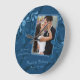 Modifiez la photo et le texte pour personnaliser cette horloge murale abstraite bleue modèle photo mariage, fiançailles ou anniversaire. Un design floral élégant.
