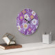 Cette horloge murale présente des fleurs et des feuilles dans les tons violet, magenta, jaune et blanc sur un arrière - plan violet.