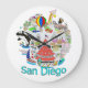 Tant de choses à voir et à faire dans la ville de plage San Diego. San Diego est représenté à travers une collection fantastique de monuments et attractions emblématiques, dont la faune, l'architecture et les parcs d'attractions. Des couleurs vives et des designs ludiques transmettent les offres vibrantes et diverses de la ville.