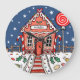 A colourful illustration of a consolive gingerbread house. The outside of the house is decorated with two candy canes and has a large lollipop tree in the garden. The ground is covered in bright white icing sugar snow and strewn with sweets.
