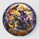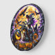 Cette image est une horloge murale décorative avec un thème d'Halloween vibrant et éffrayant. Le visage de l'horloge comporte une sorcière aux cheveux violets chevauchant une moto, accompagnée d'un chat noir sur le siège arrière. La roue avant de la moto est une lueur jack-o'lanterne. Dans l'arrière - plan, une grande lune jaune est entourée de chauves-souris volantes et de corbeaux. Les numéros de l'horloge sont éparpillés autour de la frontière, et l'expression "HALLOWEEN IS COMING" est affichée en bas. Les couleurs sont un mélange de violets, d'oranges et de noirs, créant une ambiance festive et éffrayante.