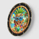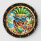 Ce garde-temps rond animé offre un accueil tropical gai. Il présente une figure souriante avec des lunettes de soleil bleu cool et un casquette feuilleté d'ananas, entouré d'éléments d'une scène de plage ensoleillée. Des palmiers, un océan bleu calme, un soleil éclatant, un cocktail vert rafraîchissant et des leis colorés remplissent l'arrière - plan. Une enseigne "WELCOME" est installée sur la plage de sable fin. Le garde-temps a un cadre noir, mettant l'accent sur l'ambiance colorée et festive de l'île.