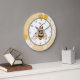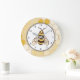 Main drawn illustration of a cute bumble bee centered on a white clock face with grey numbers and a background of yellow orange honeycomb hexagons.