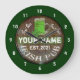 Personnalisez facilement ce panneau de pub irlandais à effet en bois en détresse fait pour ressembler à un vieux baril de bière et graphique en bière verte avec un clou de shamrock vert porte-bonheur avec votre propre texte ou nom pour vos célébrations de la Saint Patrick à boire.