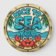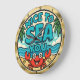 Cette horloge circulaire murale présente un joyeux crabe rouge caricaturé qui s'amuse largement sur une plage de sable. Derrière le crabe, les vagues de l'océan se glissent doucement sur le rivage, encadré par deux palmiers. L'expression ludique "NICE TO SEA YOU" est affichée en grandes lettres bleues à bulles contre un ciel clair. L'horloge est finie avec un cadre doré et en ruban.