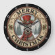 Illustration circulaire festive et charmante d'un renne dans un cadre enneigé et boisé. Le renne porte un chapeau rouge orné de baies sèches et d'un foulard rouge et noir en plaid. L'arrière - plan présente une scène hivernale paisible avec des arbres enneigés. L'image est encadrée d'une bordure rustique à texture bois aux motifs floraux ornés et les mots "MERRY CHRISTMAS" écrits en lettres courbées et en gras. L'ensemble est chaleureux et vintage.