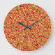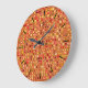 This clock with yellow-haloed black ticks is made from a "terra cotta" orange textured mosaic square tiles pattern with regions of red, rust, yellow, black, gold, olive green, and other earth earth tones randomly dispersed throughout. This unique abstract design has a matte appearance reminiscent of unglazed fired clay.