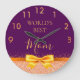 Élégant, classique, glamour et féminin. Un arc de couleur or. Arrière - plan violet. Avec le texte : World's Best Mom. Nombre d'horloge doré de 9 à 3.