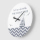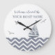 This contemporary sailboat clock is done entirely in a grey and white color scheme. The water is a grey and white chevron zigzag pattern and the sailboat has a modern line art pattern in the sails. There are three seagulls flying overhead. Typography reads Welcome aboard the YOUR BOAT NAME, which you personalize with the "personalize this template" button on the right. The first line is also customizable so you can change it to whatever you like. i.e., "Welcome aboard Jack's sailboat", "Time to go sailing with Jack and Michelle", etc.