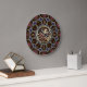 Custom Art Wall Clock : Unique design eastern mosaic mandala design inspired, in colors of purple, earth browns, red pink, turquoise, centered with the phrase 'Bismillah" in gold look, Arabic calligraphy in the center, for daily Muslim blessings at home or office