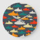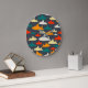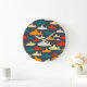 Horloge motif simple mais douce de requin en marine, turquoise, rouge, orange, jaune et gris.