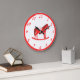 Cette magnifique horloge murale de Noël présente une image art numérique d'un mignon cheval à bascule de style scandinave. Le cheval est rouge avec une crinière rouge foncé, la queue et les sabots. Le cheval sympathique sourit. Il a une selle blanche et des rois avec de jolis motifs de style Scandi rouge sur la selle, y compris le soleil, la lune et les étoiles, les coeurs et les fleurs. La base du cheval rocking est rouge et est couverte de feuilles blancs. Le design a été inspiré par le cheval suédois Dala.