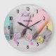 Personalized kitchen wall clock with a pretty pastel colored photographe. Featuring cake decorating items in pastel blue, pink, peach and yellow. Set upon a wood table with little colorful beads.
