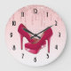 Une horloge à la mode moderne. L'arrière - plan a l'image d'une parties scintillant scintillante rose étincelante le long du sommet. Le reste de l'arrière - plan est un délicat dégradé de couleur rose pastel. Une paire de stilettos roses à talon élevé au centre. Face d'horloge de police de style Art déco.