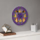 A pretty butterfly decorated clock with orange and green, brown/gold, et orange and black butterflies on a graduated purple and yellow background. Clock details are in a metallic green with gold highlights and two gold rings.