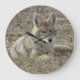 Coyote Pose Une Horloge "numérotée" . Un jeune coyote se détend après une matinée à la poursuite de souris dans les prairies à herbes courtes du sud de l'Alberta.